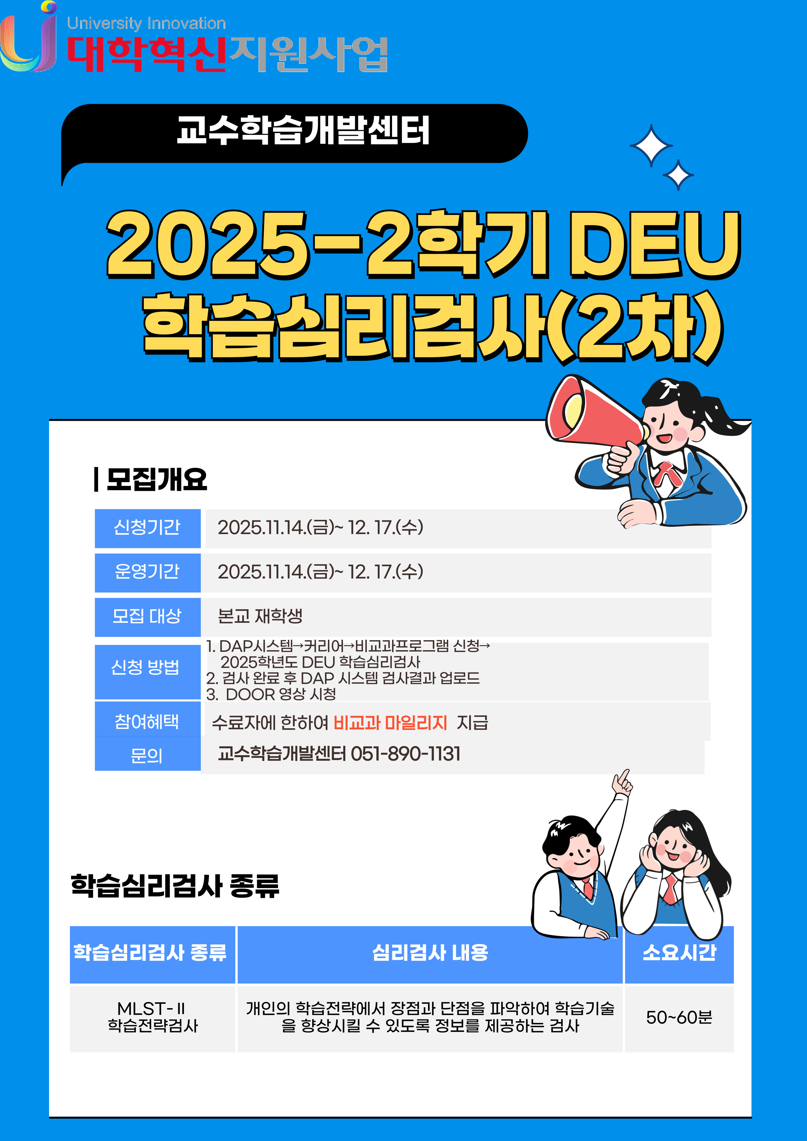 교수학습개발센터의 학습지원 프로그램인 2025-2학기 DEU 학습심리검사(2차)를 다음과 같이 안내 하오니 많은 신청 바랍니다.