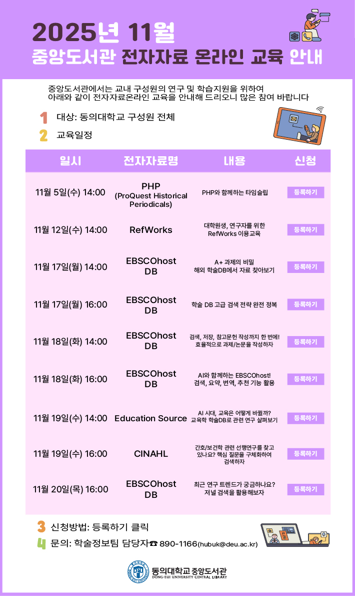 중앙도서관에서는 교내 구성원의 연구 및 학습지원을 위하여 11월 전자자료 온라인 교육을 다음과 같이 안내해 드리오니 많은 참여 바랍니다.